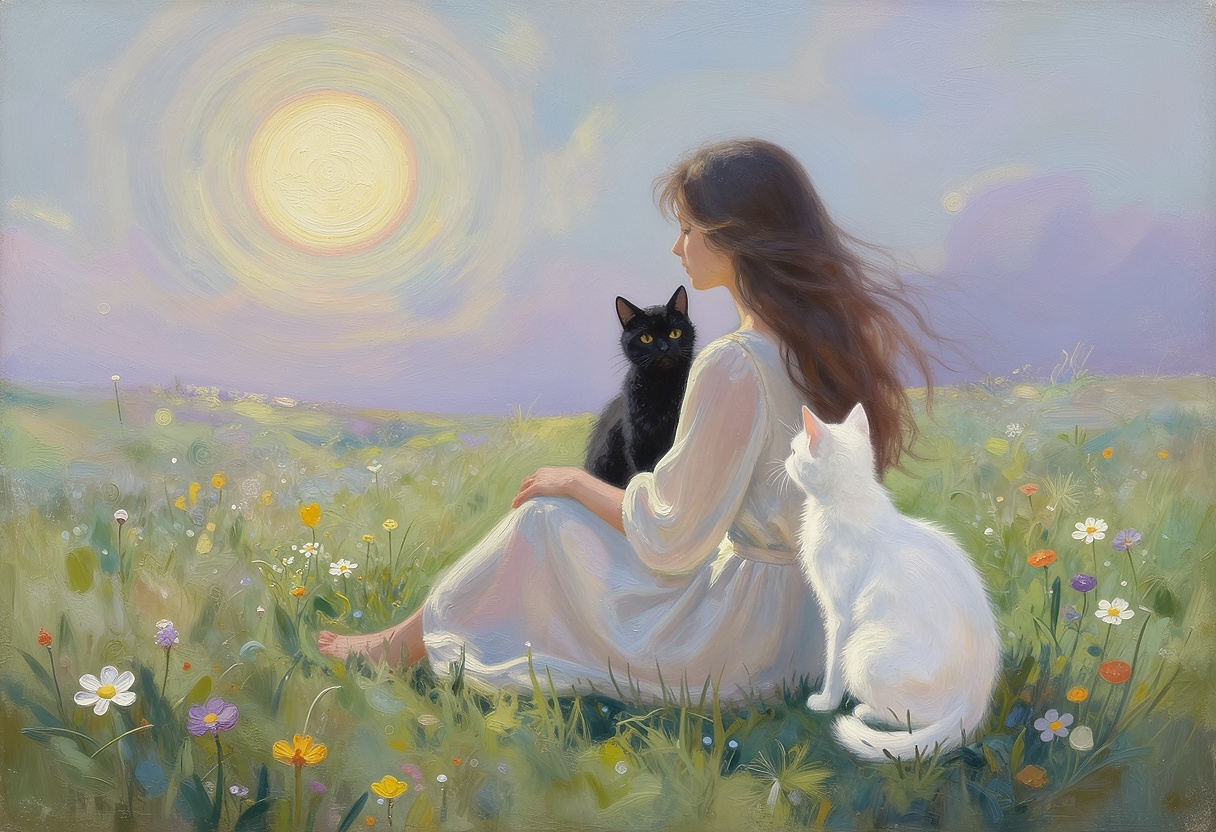 Výraz ženy sedící na rozkvetlé louce je klidný. Sedí zády a dívá se před sebe. Klidný výraz potvrzuje, že její mysl již nebloudí v minulosti ani v obavách o budoucnost. K ženě je přitulená černá kočka, opírá se o její rameno, druhá, bílá kočka, je přitisknutá k ženiným zádům. Obraz působí harmonicky, černá a bílá kočka jsou zde výrazným symbolem duality a dosažení celistvosti skrze rovnováhu protikladů, kdy je kladen důraz na duševní rovnováhu. Skutečné zdraví a regenerace přicházejí z vnitřního smíření se všemi částmi naší bytosti.