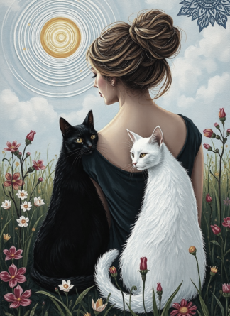 Černá kočka symbolizuje noc, podvědomí, intuici a naše stíny. Bílá kočka představuje den, vědomí, logiku a vnitřní světlo. Skutečná regenerace nastává tehdy, když přestaneme bojovat sami se sebou. To, že jsou kočky k ženě přitisknuté, naznačuje, že své „vnitřní šelmy“ (emoce a myšlenky) zkrotila a přijala. Jsou jejími spojenci, nikoli nepřáteli.