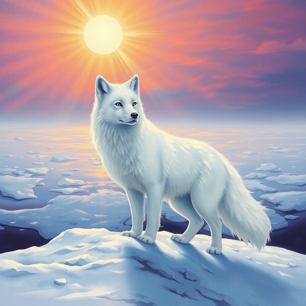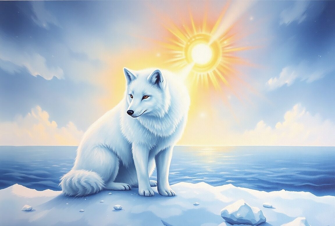 Polární liška v záři slunečního světla a setkání sní v čase zimního slunovratu naznačuje příchod naděje, čistého vhledu a vnitřního klidu
